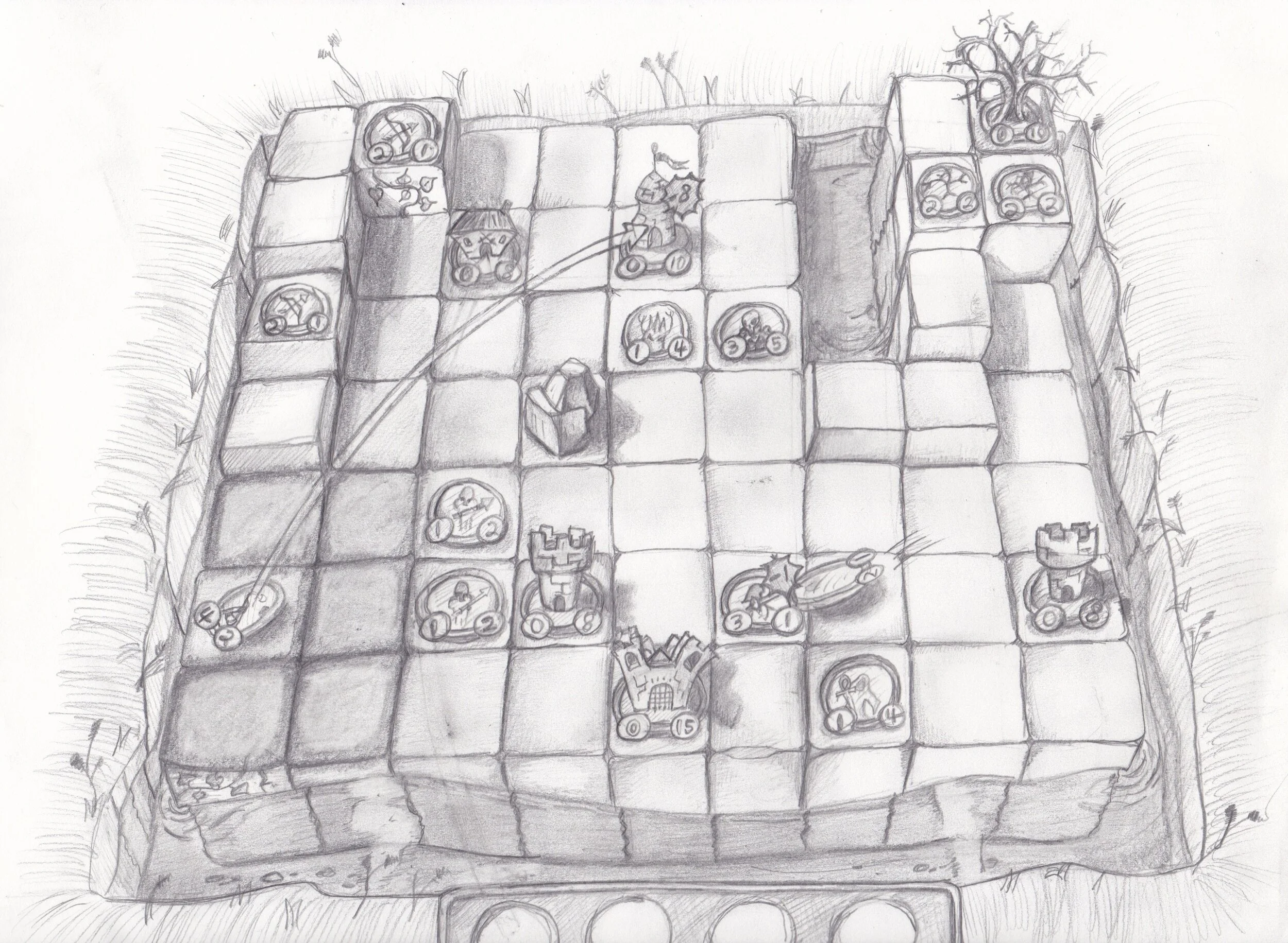 The first thing I started to do when trying to find the art style for “A Token War” was make some concept sketches. I had a picture in my mind about what I thought I wanted the game to look like, but it was sort of out of focus. I guess maybe it was just a poorly formed idea but “out of focus” sounds more...art-ish. This is what I came up with after trying to commit what was in my head to paper.